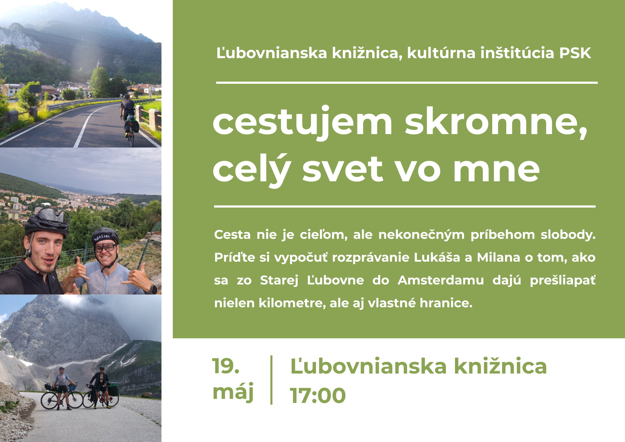 Pozývame vás na inšpiratívny večer s Milanom Sivuľkom a Lukášom Petijom – bývalými spolužiakmi gymnázia, ktorí vymenili pohodlie za sedlo bicykla. Prepadli bikepackingu a cesta na dvoch kolesách pre nich znamená absolútnu slobodu.