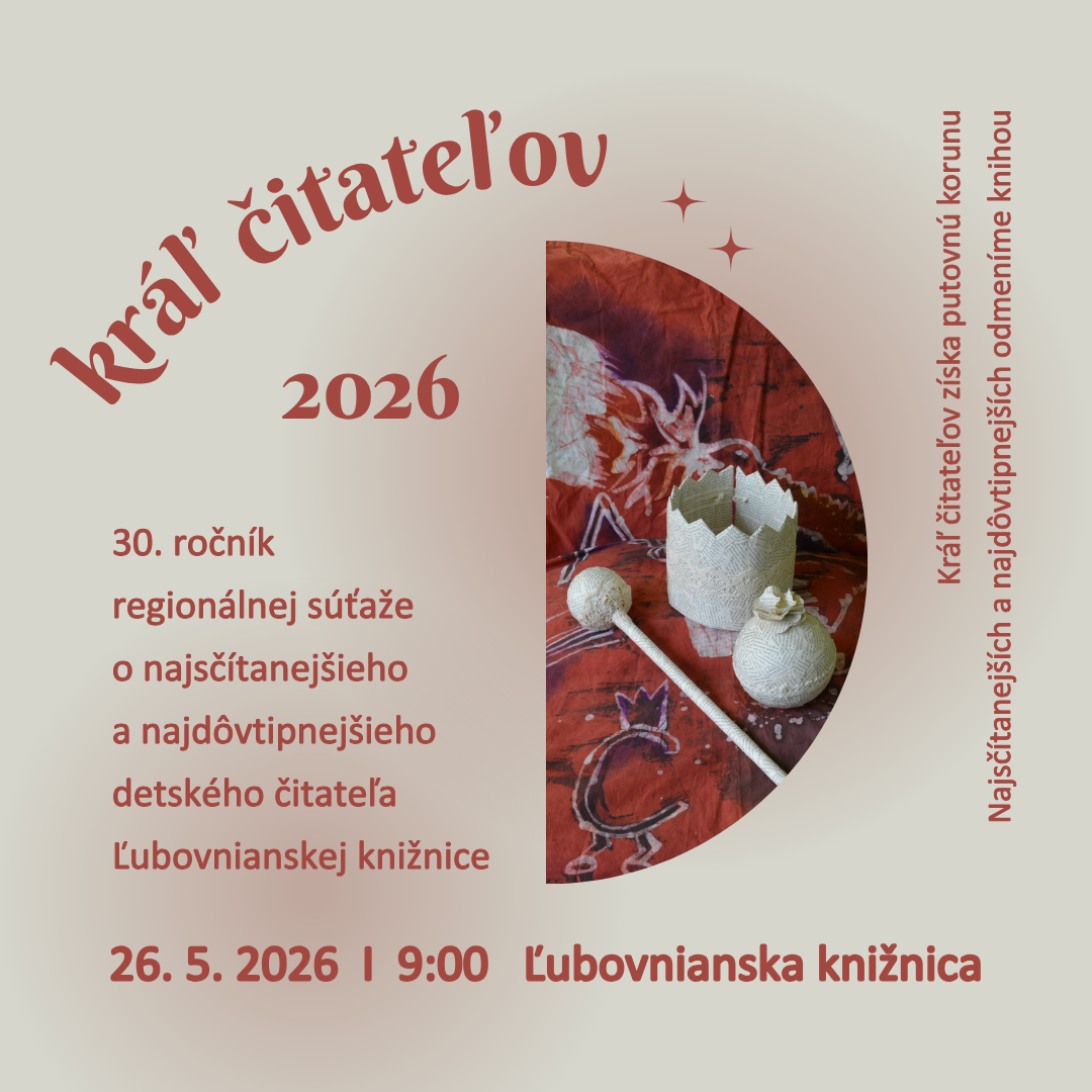Adresa na doručenie: Ľubovnianska knižnica, Letná 6, 064 01 Stará Ľubovňa.Dôležité: Prosíme, aby každá práca na zadnej strane obsahovala meno autora, vek, názov diela, školu/krúžok a kontakt na pedagóga či vedúceho. Oceneným autorom následne zašleme osobnú pozvánku na slávnostné vyhlásenie výsledkov, ktoré sa uskutoční 16. septembra 2026.