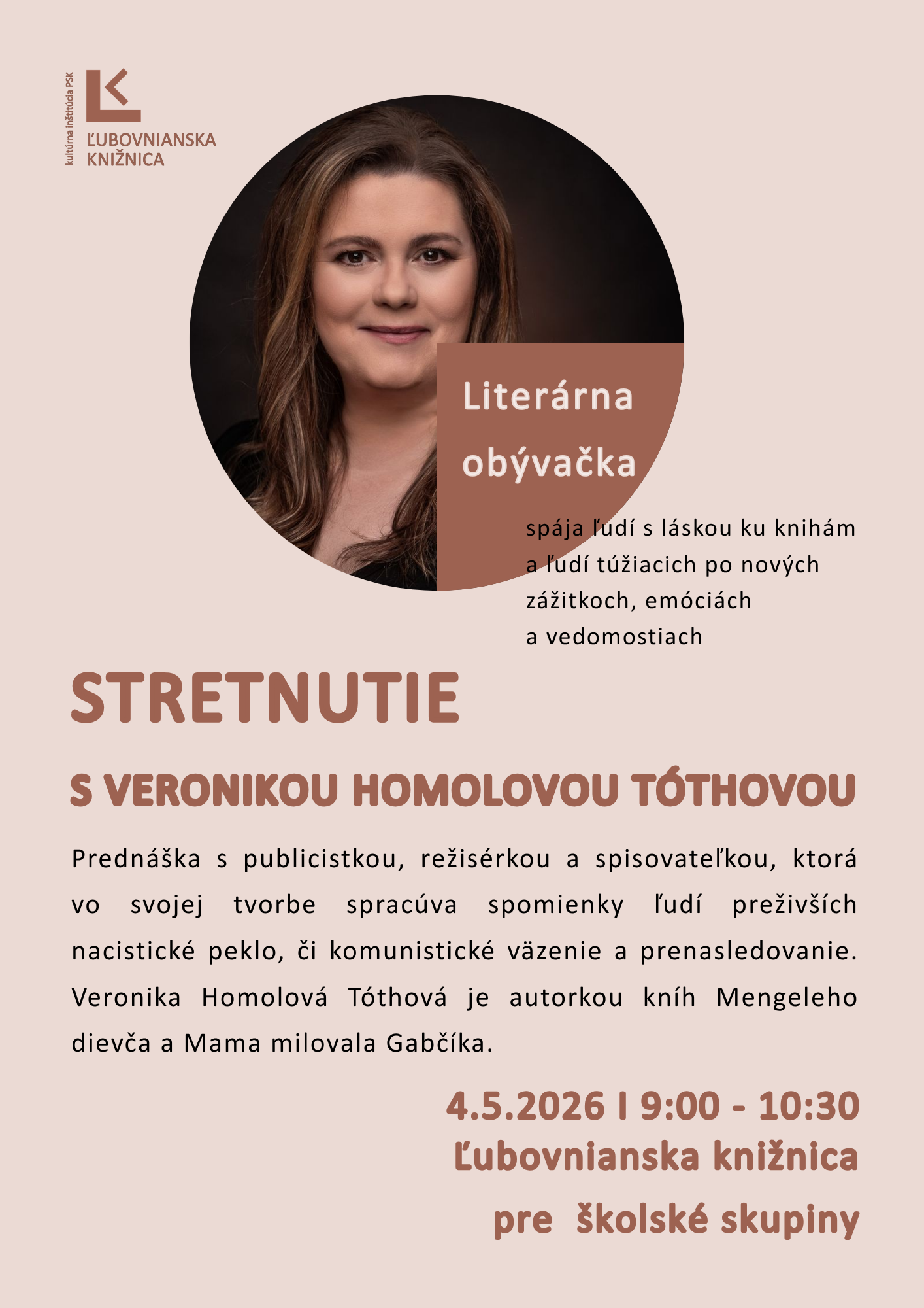 Prednáška s publicistkou, režisérkou a spisovateľkou, ktorá vo svojej tvorbe spracúva spomienky ľudí preživších nacistické peklo, či komunistické väzenie a prenasledovanie. Veronika Homolová Tóthová je autorkou kníh Mengeleho dievča a Mama milovala Gabčíka.
